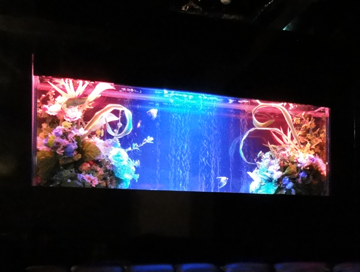 一見リビングのように見えるこちらの空間は、実は企業の応接室。 最近では、このようにエンターテイメント性を取り入れた企業空間が多くなっており、 来客者様に対するおもてなしや、ゆとり、企業ブランディングイメージを高める為にユニークな空間設計を行う会社が増えている。 こちらの水槽は、打ち合わせのテーブルとテーブル間を水槽で間仕切りした。水槽にはBARカウンターテーブルを付け、専用チェアに腰掛けながら水槽を眺めて商談をする事ができる。テーブルに写り込むブルーの光が何ともいえない美しさを演出している。