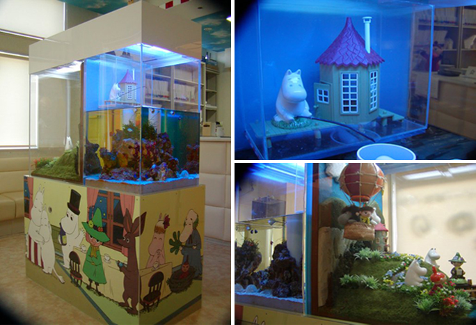 水槽部分は水を半分だけ張り、上部にはムーミンが釣りを楽しんでいるオブジェを設置。