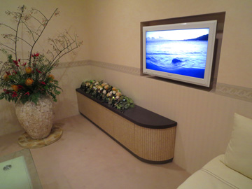 金属系のラインが入ったスタイリッシュな壁面を採用し、そこに埋め込まれるのは奥行わずか12cmの薄型造花水槽。